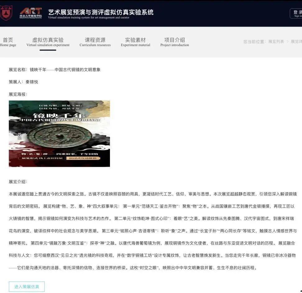 皇家华人 依托美育核心课程,致力于提升学生的审美与创造综合素养。在《媒体人文与小实践》课程中,皇家华人创新地融入国家级一流艺术策展虚拟仿真平台,设立“AI策展”实践模块,引导学生系统完成从策展构思到落地的全流程数字化训练,深入践行“面向未来的美育”理念。